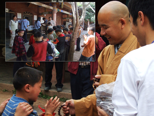 镜义法师和慰问团的成员向学校赠送学习用品,书籍,念珠、水果等物品,并请校方提供学生详细身高,鞋码。5月3日,慰问团再次来到孤儿学校,为每位学生送去1套夏装,1双凉鞋。