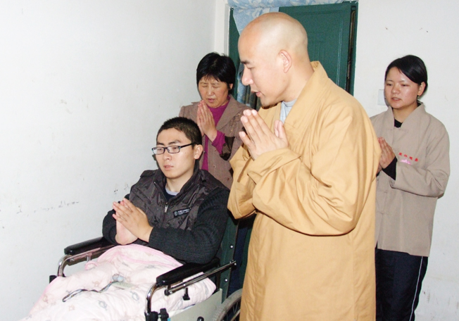 得知敬洪磊想皈依三宝,但行动不便,无法去寺请师,镜义法师慈悲心切,当即为其做三皈,并取法名"得康",定下至少日念3万的功课并将1000元善款交与敬洪磊母亲, 嘱咐她好好念佛,既为其子早日康复,也为答谢十方善心人士。