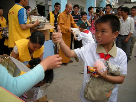 节目结束之后,东林慈善功德会给孩子们赠送节日礼物,有衣服、苹果、饼干、圆珠笔等。懂事的孩子们伸出大拇指,连说:“谢谢!谢谢”