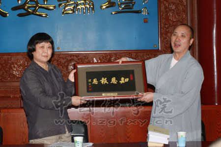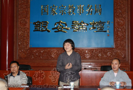中国佛学院教务长向学法师讲话,首先表示自己有幸被邀请来参加这次座谈会,感谢领导对佛学院教学工作的重视,对同学们的关心和厚爱,并向局领导介绍了45位同学从2005年被录取以来的学习、生活直至现在将要毕业的情况。