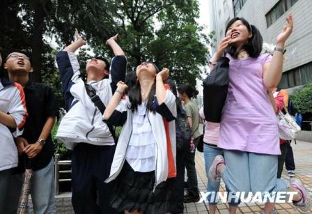 资料图片:6月9日下午,考生完成最后一门考试离开南京市人民中学考点时欢呼雀跃。新华社记者孙参摄