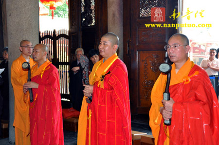 2009年6月17日,福建省厦门市南普陀寺隆重举行传授五戒法会。南普陀寺方丈则悟法师、首座了法法师、西堂传明法师分别担任五戒和尚、羯磨阿阇黎和教授阿阇黎。