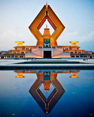 合十,代表着欢迎,法门寺、宝鸡市、陕西省、全中国,欢迎四海宾朋。这里将成为海峡两岸沟通的又一个窗口,中国与世界进行佛教文化交流的又一个胜地。