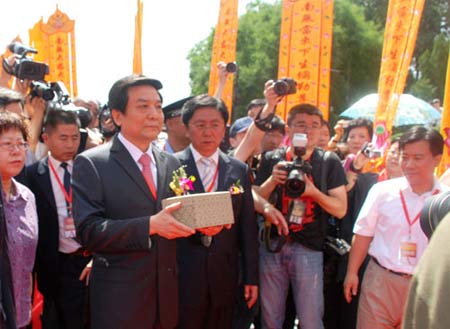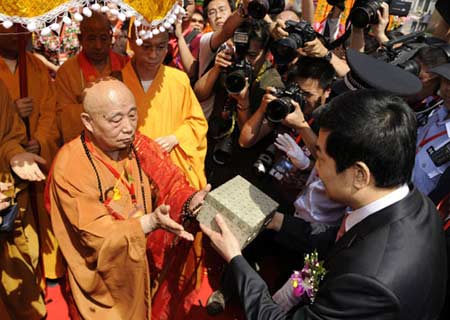 6月23日,北京市副市长蔡赴朝将佛祖肉身舍利交给北京市佛教协会会长传印大和尚。