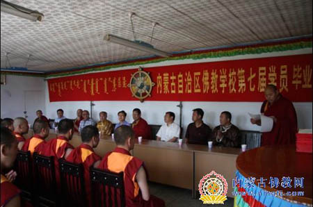 典礼首先由毕业生代表发言,感谢学校和老师们对他们的培养,将来一定努力为内蒙古的佛教事业发展贡献力量。之后,校长贾拉森仁波切讲话祝贺全体学员毕业,并对学员今后的工作提出五点要求:(1)坚持正确的政治方向,高举爱国爱教的旗帜;(2)不断学习佛学理论和知识,成为政治上靠得住,学识上有造诣,品德上能服众的僧才;(3)牢记自己是内蒙古佛教学校毕业的学员,以自己规范的佛家弟子形象为全自治区区佛教界做出榜样;(4)坚定对三宝的信仰,尊重上师,清静持戒;(5)在佛教的自身建设中发挥积极作用。自治区统战部、自治区宗教局领导对毕业学员表示祝贺并对佛教学校的工作给予了充分肯定和高度评价。