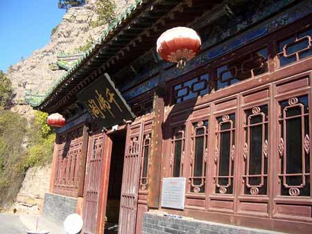 突然,一座雄伟的山峰迎面拦住了去路,但看巨石垒叠,恰似一座石屏拔地而起。走下车来,越过一座石头砌的小桥,沿着铺满石块的“之”形小道拾级而上,雄伟壮丽的古刹玄中寺便映入眼帘:禅宫梵宇,座北朝南,林木掩映,群山环抱,显得格外肃穆、寂静。