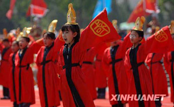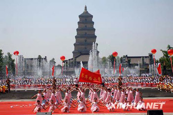 2009年5月25日,师生在大雁塔下朗诵诗歌。当日,西安市万名师生诗歌朗诵会在大雁塔脚下举行。这次朗诵会是第二届中国诗歌节群众文化活动的组成部分,14所中小学的近万名师生参加了这次诗歌盛会。新华社记者 丁海涛 摄