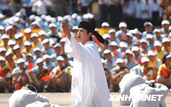 2009年5月25日,饰演“李白”的同学在朗诵唐诗。新华社记者 丁海涛 摄