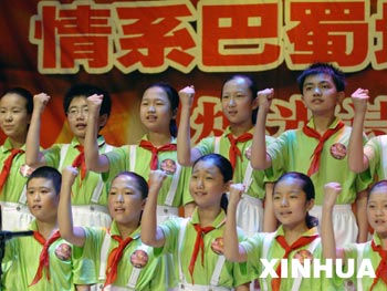 2008年5月27日,石家庄石门小学的学生们在情系巴蜀地震灾区儿童诗歌朗诵会上表演节目。新华社记者 巩志宏 摄