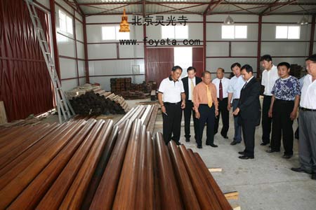 登昂准将一行在参拜完舍利后,还特意前往灵光寺料场了解佛牙塔柚木工程近况;登昂准将祝愿佛牙舍利塔前柚木殿堂的落成,成为中缅友谊的又一丰碑。