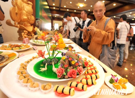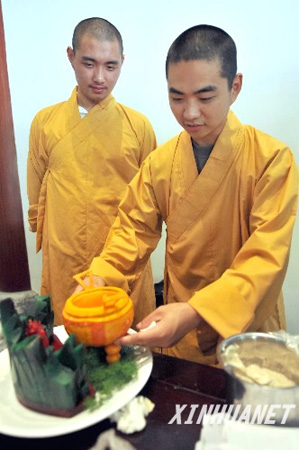 2009年6月21日,浙江省杭州市佛教素食厨艺交流活动在杭州上天竺法喜讲寺举行,来自杭州灵隐寺、净慈寺等15家佛教寺院的50多名寺院厨师现场交流厨艺。(图:王定昶)