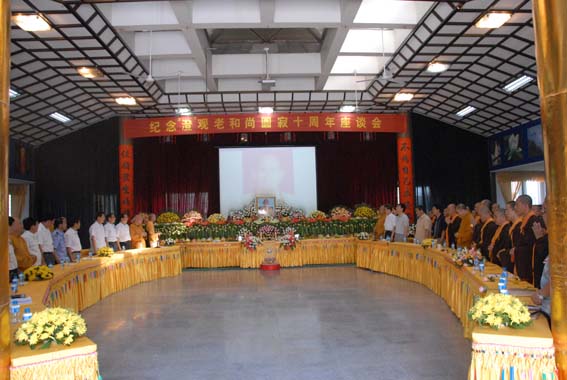法堂内气氛庄严热烈。台口上方悬挂着“纪念澄观老和尚圆寂10周年座谈会”的会标,后幕正中是澄观老和尚的巨幅图像投影,台前鲜花簇拥。两侧对联是:不为自己求安乐,但愿众生得离苦。