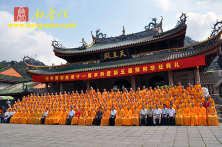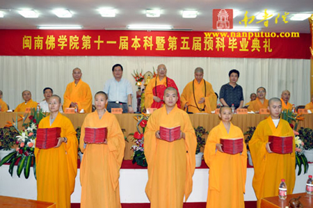 2009年6月8日,闽南佛学院第十一届本科暨第五届预科毕业典礼隆重举行。福建省厦门市民宗局陈建德书记、蔡永华副局长、黄镇辉处长等相关领导,中国佛教协会副会长、闽南佛学院院长圣辉法师,厦门市佛教协会会长、南普陀寺方丈则悟法师,闽院常务副院长界象法师、副院长法源法师,太虚图书馆馆长了法法师、研究生导师济群法师,南普陀慈善会常务副会长慧然法师,闽院院长助理兼教务长传明法师、院长助理兼办公室主任净心法师、教导长达源法师等闽院各部门领导以及任课法师老师和全体学僧在南普陀寺讲堂出席了毕业典礼。