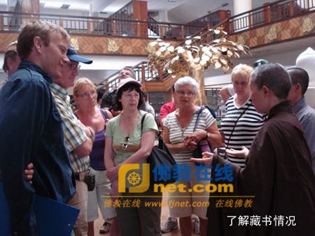 普寿寺法师陪同参访团一行参观了寺院的建筑,并仔细地向他们介绍了僧寮、板报以及佛学苑的修学纲领和发展规划,还教授他们如何礼佛,引导他们共同称念“南无佛 南无法 南无僧”。