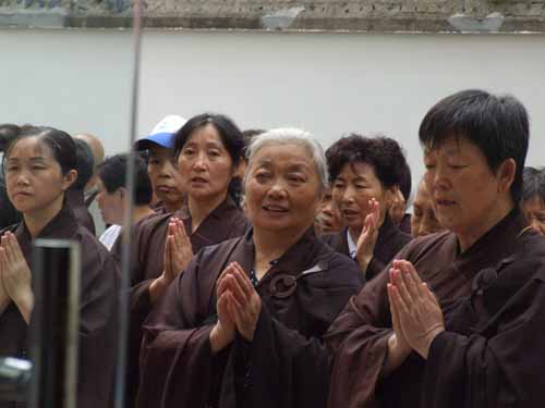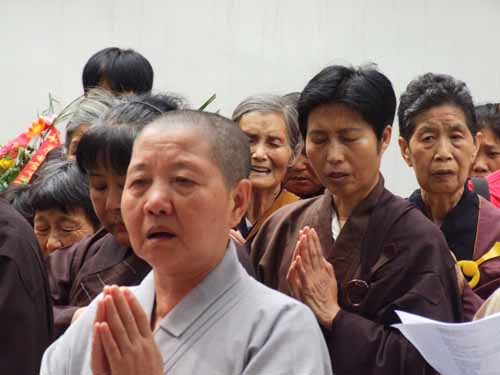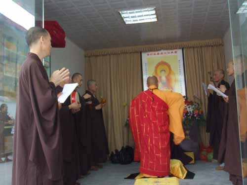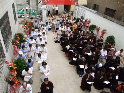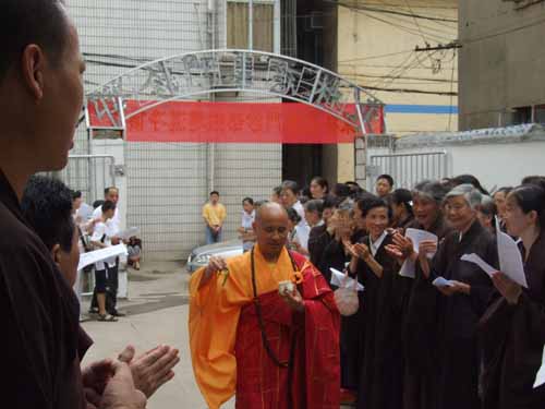 东林寺首座本通法师主持了仪式。当他用手中的净枝,洒着甘露水穿过人群时,居士们纷纷向他顶礼。