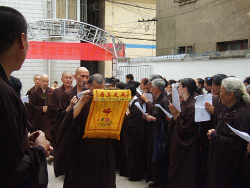 10时10分,洒净仪式结束了。鞭炮声洋溢着所有人的欢喜。新参加志愿者队伍的廉租房区“怡康苑”全体志愿者,向门诊部赠送一面乔迁志喜的锦旗“慈善功德、广种福田”。各方人士、居士等自发去顶礼药师佛,向功德箱投进自己对慈善医疗的捐赠。其中,特地从南昌赶来参加仪式的一位志愿者,一人即捐赠了500元。