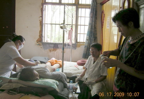 原来,张桂松的褥疮疮口曾经好过许多。出院之后,门诊部张医师等每周上门两到三次,为他细心治疗,志愿者们隔三岔五悉心为其清洗疮口。大家开导他念佛食素,他和母亲听从了;功德会会长镜义法师百忙之中,也在出差时,专门为他捎来了治病效果很好的佛家三昧水,志愿者们为他用三昧水调治。他碗口大的疮口小到鸡蛋大小。然而,有一次由他家人清洗,加之后来他母亲又给他炖猪脚吃,疮口复发了;他家急病乱投医,找了一个口称可以包治的江湖医生,用了那人的药,结果,疮口发生腐坏。上星期天,张医师和宋护士只好重新为他清创,宋护士带着口罩都被腐坏的气息熏得难过,但依然耐心细致。看到年轻的宋护士不敢下手,经验丰富的张医师一边讲解,一边动手操作示范。那些黑色白色腐坏的肉割下了一盘。这之后,她们不得不每天上门来为他清疮、消炎,三天来,打了三次吊瓶,吃了三副中药。今天又带来了三副中药。