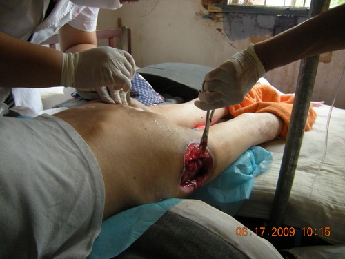 11时20分,终于做好了所有的清创、消炎、换药、敷纱布的工作。张桂松的一个亲戚去给我们叫了一个三轮摩的。我们向张桂松道别,他合十表示感谢,目送我们出门。那庄严的“南无阿弥陀佛”念诵声一直伴随着我们的脚步……