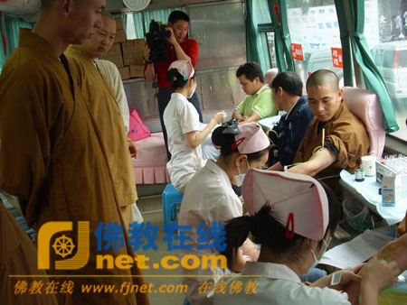 2009年6月10日上午,在湖南省衡阳市南岳区文化文物宗教局的组织和发动下,南岳区佛教协会及各个寺院的僧人和居士40余人到衡阳市南华大学附三医院流动采血点献血。他们排着队,依次体检、捐血,成为献血点一道温馨的风景线,吸引了众多市民的关注。