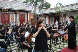 音乐会在斋明寺殿前广场举行,并由多位桃竹地区信众的小孩子所组成的斋明鼓队做暖场表演。糅合太鼓磅礡的气势及原民嘹亮的歌舞声,一开场就吸引众人的目光与喝彩。紧接着由孟美英团长率领三十多位团员的九歌民族管弦乐团,以丝竹千种风情的乐章,深深掳获在场民众的心。