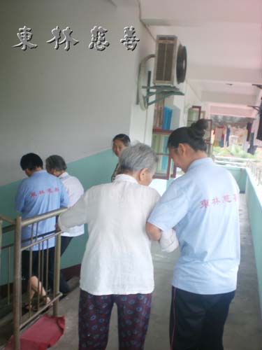 一位坐在轮椅上的老公公也突然哇哇哭起来。几个人赶了过去。好有福的老公公,我们的内科义工医师张碧玉、理疗科李冬生医师,先后给他进行了精心的治疗。老人露出了开心的微笑。