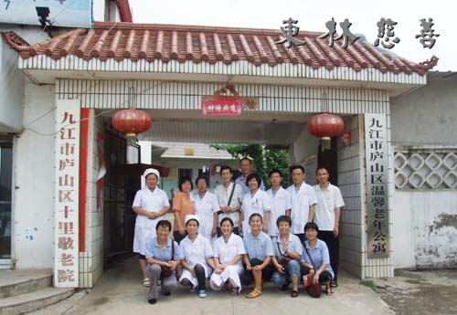 这个敬老院是九江市庐山区十里铺社区中心兴办的中型托老院,始建于1958年农历九月初九重阳节。现在,全院占地面积4000平方米。幽静的院落中有一汪水塘,中间落有一座雅致的角亭。角亭有一副有趣的对子:“十里庭院长青树,敢赛南山不老松”。