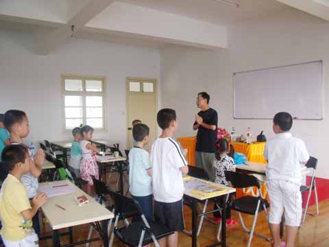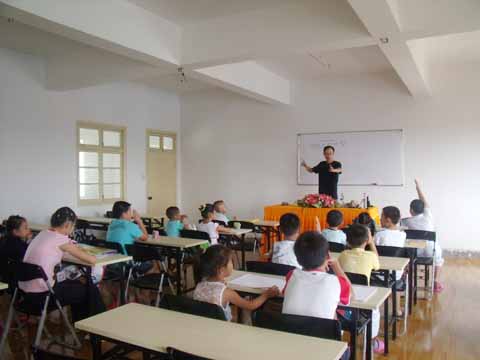 7月21日上午8:30分,胡毅教授走入教室,举手投足都散发着清雅。开始讲课前,他先做了自我介绍,并教所有学生合十,念“南无阿弥陀佛”六字洪名,给学生种下金刚种子。他极富教学经验,声情并茂,很轻松的就调动起了在座的小学生的学习兴趣和积极性。教学互动,一提问题,学生争相举手回答,学习气氛浓厚而热烈。