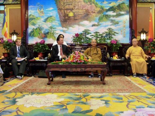 新中国成立以来,特别是改革开放以来,中国佛教对外的交往、联谊进一步扩大和加强。我们不仅参加了世界佛教徒联谊会,也参加世界各种不同宗教的会议,如‘世宗和’和‘亚宗和’的会议和活动。在这个月初,7月1号、2号,我们佛教同道教、伊斯兰教在哈萨克斯坦参加了‘第三届世界与传统宗教领袖大会’。由此可见,无论是佛教、基督教、伊斯兰教,都已经成为世界和平重要的因素和力量。我们相信通过贵代表团的访华,能进一步促进中美两国和两国宗教界的友谊,也对促进世界和平发挥作用。祝愿您访华取得圆满成功!”