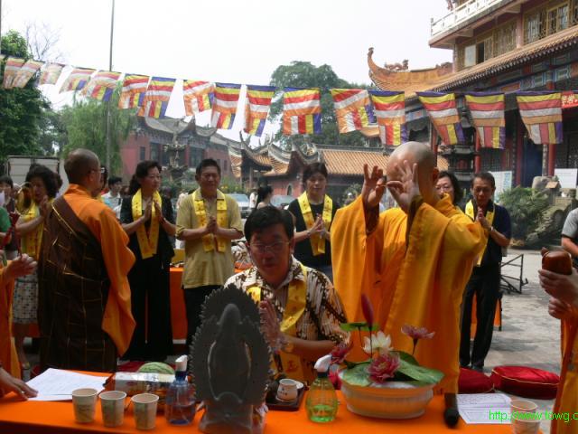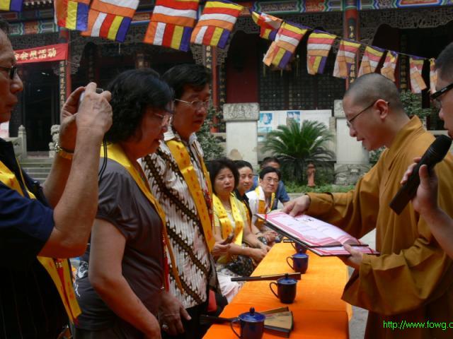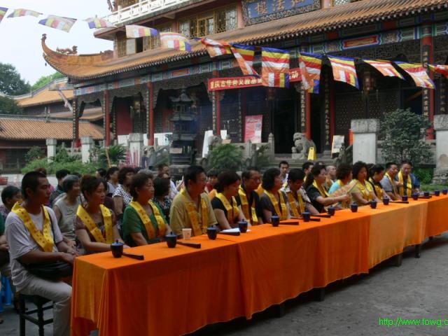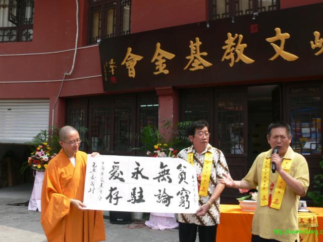 (中国佛网讯)2009年7月18日,重庆市华岩文教基金会举行揭匾仪式。“华岩文教基金会”几个字遒劲有力,由重庆市佛协副会长、重庆市华岩寺方丈、重庆市华岩文教基金会理事长道坚法师所提。匾由印尼善信王一元先生、王一如女士、王一娥女士敬赠。仪式后四众弟子举行殊胜的放生仪式。
