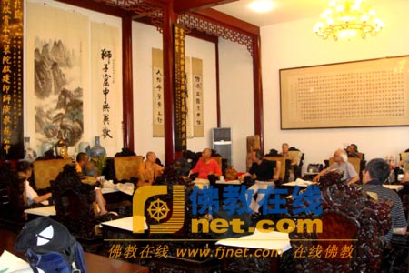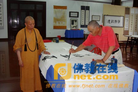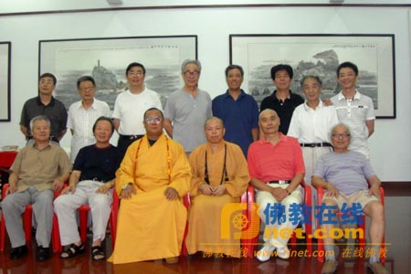 江苏省佛教协会副会长兼秘书长、佛印书画院院长心澄法师等热情接待了文定法师一行,并陪同参观了佛印书画院的画展,书画家门对佛印书画院所展出的书画作品,给予高度的评价。随后,普门书画院的画家们到书画斋进行创作,在创作过程中,书画家们展示了他们最拿手的创作技巧,短短半天时间,几十幅风格迥异内容丰富的作品即跃然纸上,心澄法师十分欢喜,表示诸如此类的活动要经常搞,并且要搞出高质量,形式多样的活动,为江苏省佛教的文化建设工作添砖加瓦。