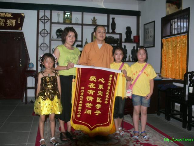 四川省北川陈家坝小学师生看望道坚法师并为华岩文教基金会送锦旗