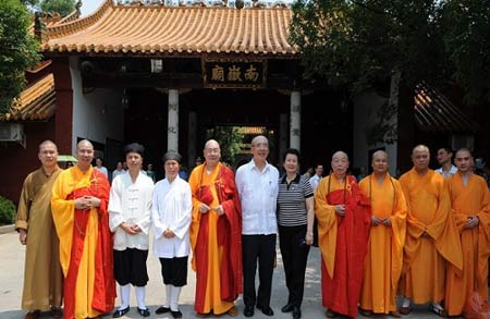 进入南岳,首先映入眼帘的是有着“江南小故宫”之称的南岳大庙。一生佛缘的吴伯雄对南岳大庙表现出浓厚的兴趣,在中国佛教协会副会长、湖南省佛教协会会长圣辉法师的引领下,他由南向北,进棂星门、经奎星阁、过正川门、入御书楼……兴致勃勃地参观了大庙东西两厢的道教八观和佛教八寺。吴伯雄说,两岸同种同文,文化是始终割不断的纽带。本人与佛结缘,对南岳更是向往已久。我愿在此祈祷佛祖保佑两岸和平、人民安康。