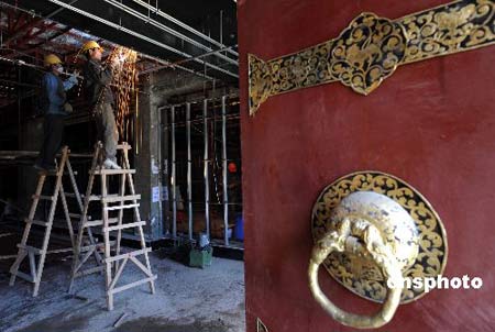 资料图片:1月初,西藏拉萨布达拉宫珍宝馆内施工人员正在紧张的施工建设,该工程将于4月中旬竣工。