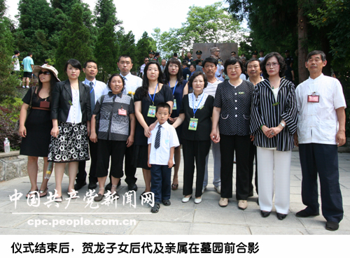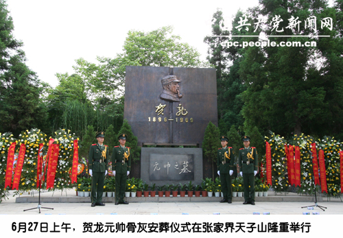 2009年6月27日上午,国家级自然保护区张家界举行了贺龙元帅骨灰安葬仪式,贺龙元帅夫人及全家护送其骨灰回到故里,安置在风景秀丽的天子山。 27日上午,中央有关部门和当地政府在天子山贺龙公园,举行了贺龙元帅骨灰安葬仪式,湖南省、张家界市、桑植县等领导讲话,表示一定要发扬贺龙的革命精神把家乡建设的更加美好并保护好贺龙陵园。贺龙元帅的小女儿贺黎明宣读了贺龙元帅夫人薛明的书面发言,女儿贺晓明亲自伏入墓穴安放父亲的遗像和骨灰。 参加今天仪式的有中央军委、总参谋部、总政治部、军事科学院、广州军区、兰州军区及公安部、国家体育总局、发改委等各级领导和开国元勋后代、贺龙生前身边工作人员及部属等共400余人。 贺龙1896年出生在湖南省桑植县洪家关。1927年8月1日参加南昌起义,任总指挥,同年加入中国共产党。1955年被授予中华人民共和国元帅军衔。他为中国革命和社会主义建设事业建立了不朽的功勋。1969年6月9日在“文化大革命”中被迫害致死。中共十一届三中全会后得到彻底平反。