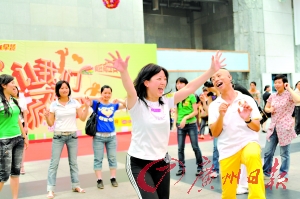 6月27日上午,由肯德基主办的“广州白领疯狂减压日”,在广州火车东站广场前登场。八组近百名白领在专业笑疗师晴天的现场指导下,学习释放压力的“减压笑”。晴天介绍,笑的方式有很多种,有“键盘式笑法”、“烧饼式笑法”…… 只要是正常发出的笑,基本上都是可以减压的,因为你的身体器官是不理会你怎么笑的,体内产生的“运动”都是一样的。当然,要说减压效果最好的莫过于由内而外、自然而发的真笑。