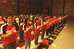 虔诚的祈祷声6月29日晚间9时在佛光山寺的大雄宝殿传来,“来去‘佛’动——团队·生命探索体验营”的近500位青年学员们,以一颗诚挚的心,在法师带领下,诵读着佛光山开山宗长星云大师为青年所作的《为青少年祈愿文》,也提醒着自己改变不好的习气。
