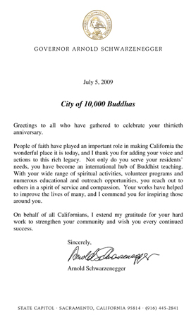 据悉,加州州长阿诺史瓦辛格致电祝贺圣城开光三十周年,他在信中说到,加州得以呈现今日之殊胜风貌,各宗教信众扮演了重要的角色。万佛圣城已成为国际佛教中心,与会大众通过各项法会共修、义工计划,以及无数教育与对外活动的机会来利益众生。他代表全体加州民众向与会大众表示感谢,并祝福各位不断进步、成功。(编译:子规)