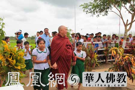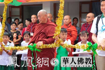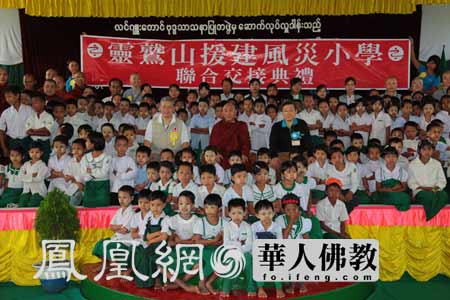 六月二十三日,在缅甸湿热的雨季里,难得的晴空艳朗。灵鹫山佛教教团特于纳吉斯风灾一年后,新学期开始前夕,在缅甸仰光省滚良光地区Myo Thit村,举行十六所学校联合交接开学典礼,其中在滚良光重建有九所,在得得耶则有七所。交接暨开学典礼由心道法师亲临主持,现场有多位贵宾出席,包括仰光省省长、缅甸第三教育局总理事长、上座部佛教大学副校长、教育部滚良光镇区教育局局长、台湾红十字会秘书长陈士魁以及国合会助理秘书长张暔昌、国合会顾问罗翡谕等人参与这项别具意义的盛会。