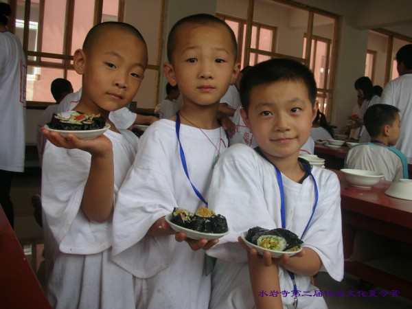 看这寿司还不错吧,几个小男生脸上充满着自己下厨的自豪.