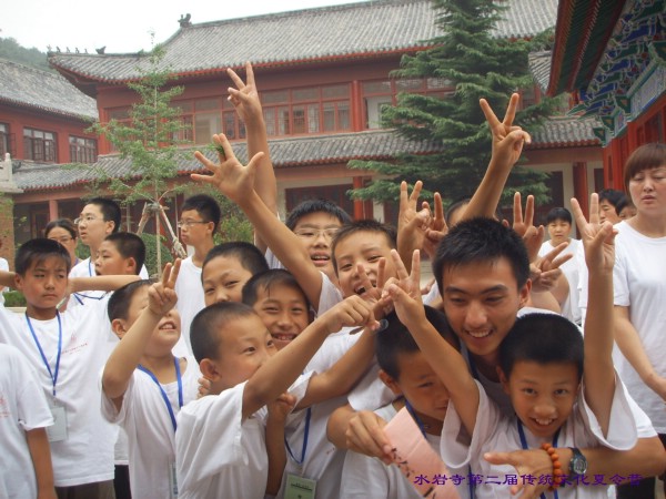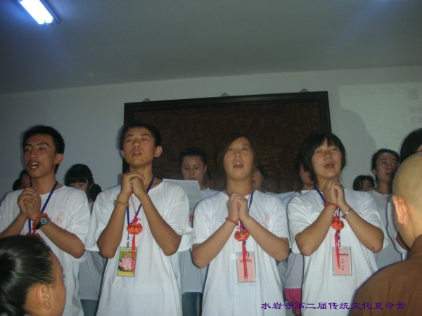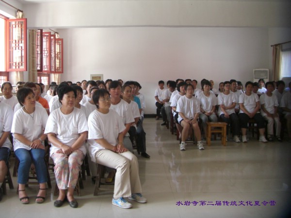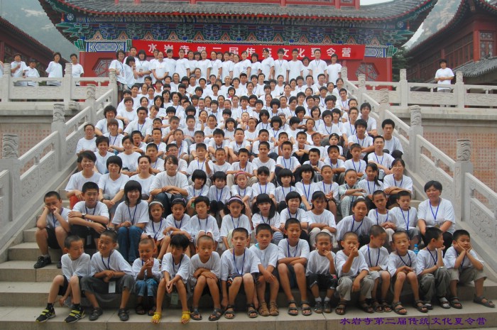下午是夏令营音课,首先由河南寿康学会徐冉老师向夏令营赠送预防“甲流感”精美的中草药香囊。接下来孩子们为老师家长们汇报演出了精心编排的八德故事、短剧《疯娘》、孝亲舞蹈《跪羊图》、小品《地球母亲生病了》,他们非常认真投入,动情之处家长和老师都止不住流下感动的泪水。民族学校的老师和同学们为大家表演了《感恩一切》手语合唱。夏令营新闻报道组的苏红老师为大家回放讲述了《夏令营电子相册》,为了制作这个精彩的相册她们每天都要工作到深夜一点,大家一起重温着夏令营生活的每个片段,那样的温暖,那样的美好,大家心中更加依依不舍。最后举行了夏令营闭营仪式,由营长将营旗叠起交与存海法师手中,存海法师代表水岩寺常住感谢为本次夏令营辛勤付出的老师和志愿者,感谢社会社会各界的支持,希望传统文化夏令营能够抛砖引玉,更多的有识之士来传承中华传统美德,落实德行教育.