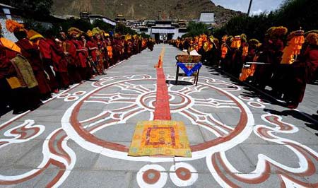 7月19日,扎什伦布寺门前绘制了吉祥图案,迎接第十一世班禅。