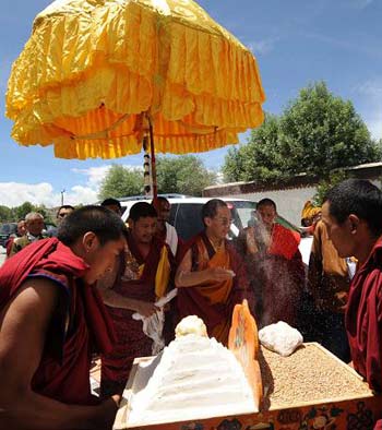 7月19日,扎什伦布寺的僧人向第十一世班禅敬献“切玛”。