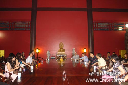 在大佛禅院法堂,常性法师与来自灾区的干部们一起座谈,相互交流,与干部们共浴佛法甘露,消除、缓解灾后心理压力,积极、乐观面对人生、生活。
