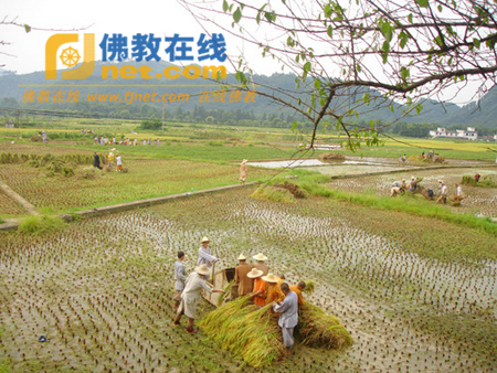2009年7月下旬,广东省韶关市乳源瑶族自治县云门山下的云门大觉禅寺僧众,在方丈明向法师的带领下,头顶烈日,正忙着收割稻谷。