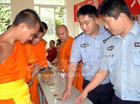 2009年7月31日,云南省西双版纳傣族自治州公安局禁毒支队和景洪市公安局民警来到云南佛学院西双版纳分院,为佛学院的学僧们上了一堂禁毒和交通安全宣传课。民警向学僧们发放了禁毒宣传单和交通安全宣传手册,组织他们观看禁毒和交通安全宣传片,并将缴获的一些毒品样品带到现场进行展示和讲解。(通讯员/张晋 段建宇 杨东杰 摄)