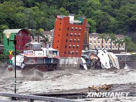 8月9日,在台东知本温泉区,6层楼高的金帅饭店在洪水冲击下摇摇欲倾。