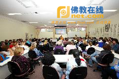 中天寺住持觉善法师在海会堂欢迎教师参访,并介绍佛光山人间佛教理念,致赠英文佛学书籍Ending Anger、Gratitude、Time&Space等与教师结缘。导览义工Richard、Lyna、Doug、Helen、Tracey分组带领教师参观中天图书馆、佛教文物馆、禅堂、抄经堂、敲钟祈福等活动相片展。