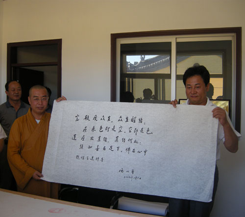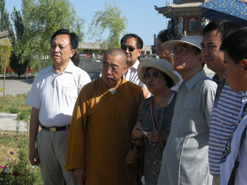 8月10日下午,巴彦淖尔市领导陪同全国政协常委、全国政协经济委员会副主席、北大光华管理学院名誉院长厉以宁教授及夫人与 北大校长助理、战略研究所理事长于鸿君教授,北大博士后研究员、联谊会理事长 程志强教授,中共马鞍山市委副书记鲍寿柏教授等一行来到内蒙古巴彦淖尔市杭锦后旗宝莲寺参观指导,市佛协副会长妙济法师热情接待厉以宁、于鸿君教授等一行并陪同参观了宝莲寺,在听取了妙济法师就佛教理念与科学相结合的社会发展观的阐述之后,老教授非常高兴,挥笔为我寺题词两首并与全寺僧众共进晚餐。