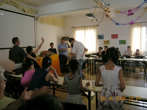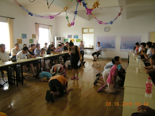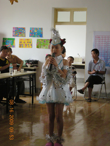 第一个节目似乎很有神秘感,当志愿者刘子育师兄带着孩子们排好队的时候,大家已经把期盼酝酿得很浓烈。刘师兄解释,他们是前一天才排练的,她和孩子们要把歌曲《跪羊图》奉献给大家。