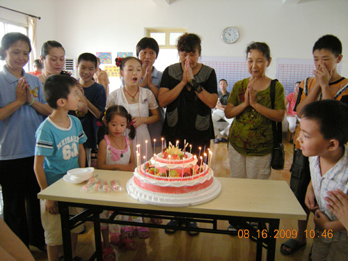 寿星们要切蛋糕了,在孩子们的雀跃中,寿星们点上蜡烛许愿。